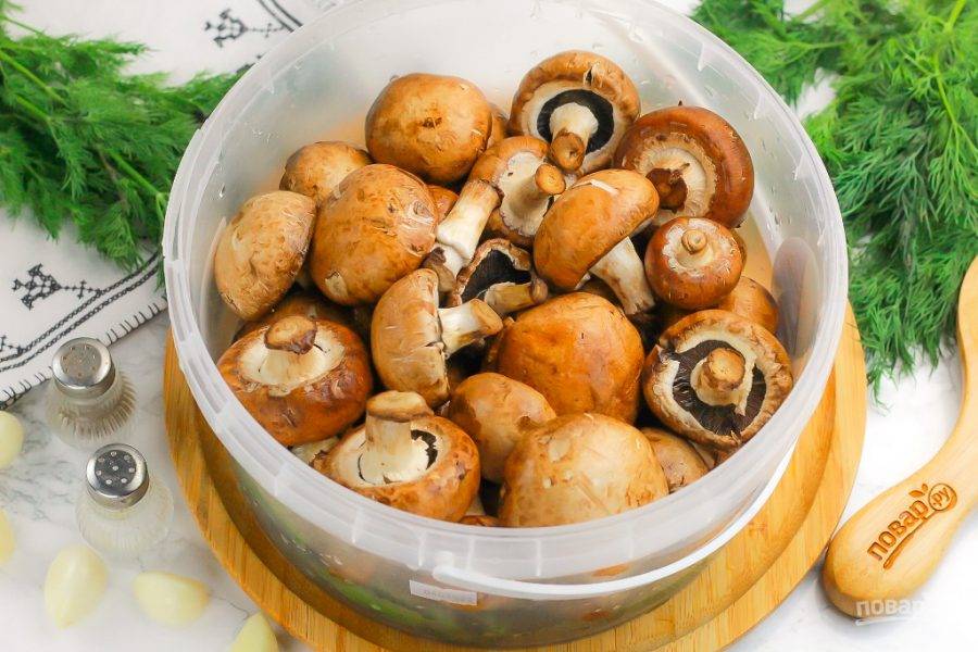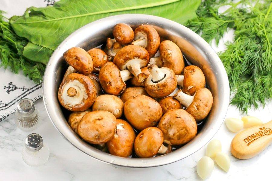 Шампиньоны залейте холодной водой, оставьте на полчаса, а затем удалите грязь, пыль и срежьте подпорченные места, если такие есть.