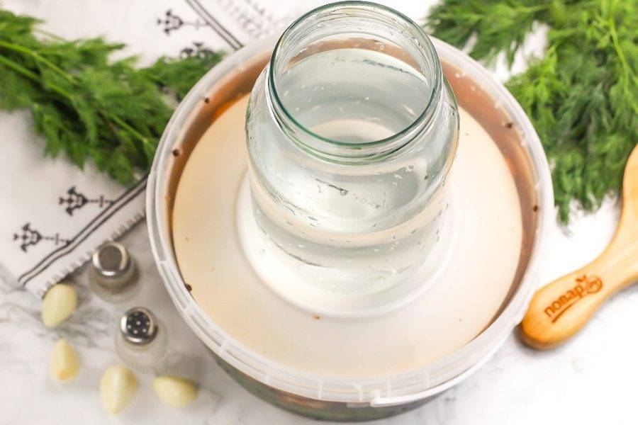 Именно поэтому обязательно поставьте гнет — накройте грибы перевернутой дном верх тарелкой и на нее установите банку с водой, гирю или другой груз. В таком виде переместите конструкцию на холод и томите минимум в течение недели.