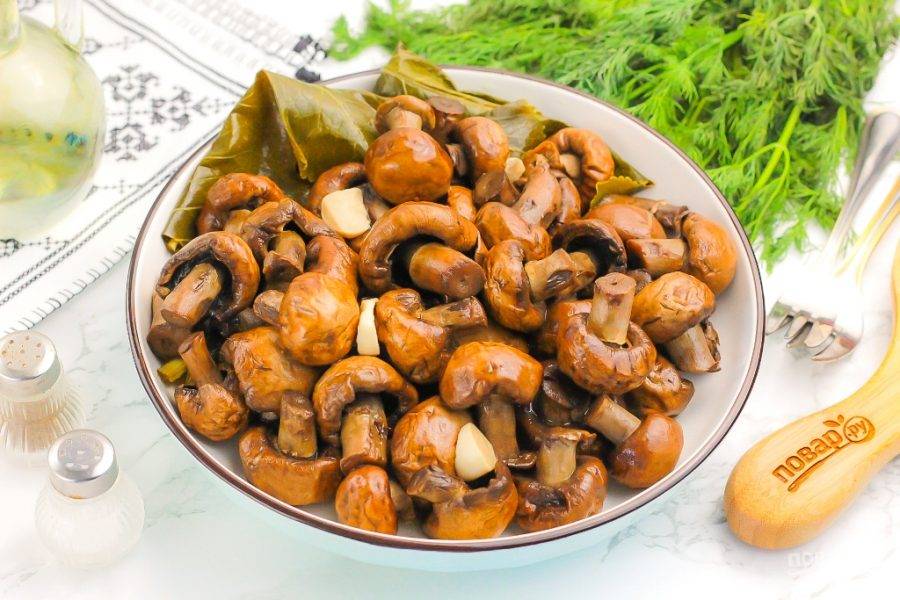 Соленые шампиньоны — прекрасная закуска для любого праздничного стола! Их подают в охлажденном виде, сбрызнув растительным маслом. Особенно вкусны они с картофельным пюре, жареной картошкой!
