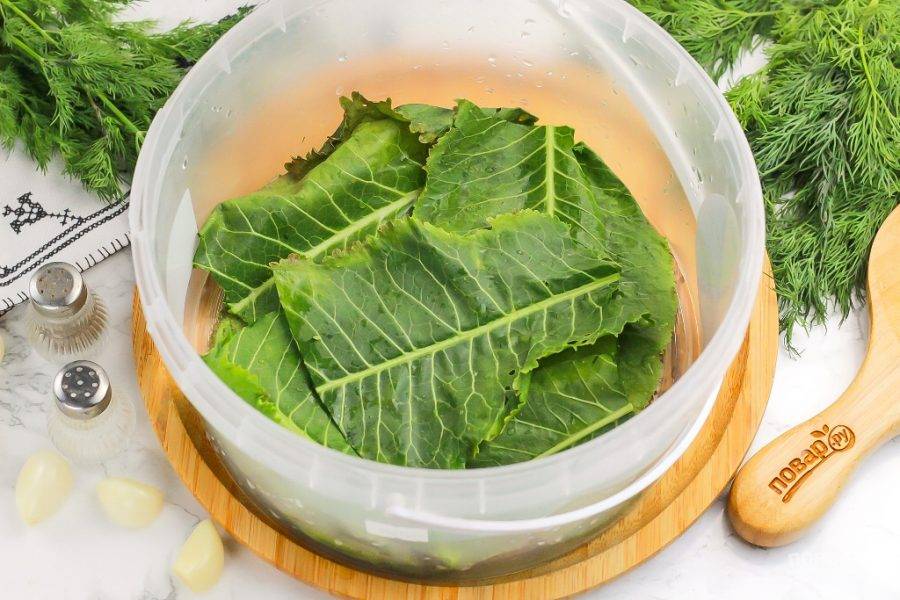 В емкость для пищевых продуктов или стеклянную банку выложите промытые листья хрена. По желанию их можно нарвать руками на части.