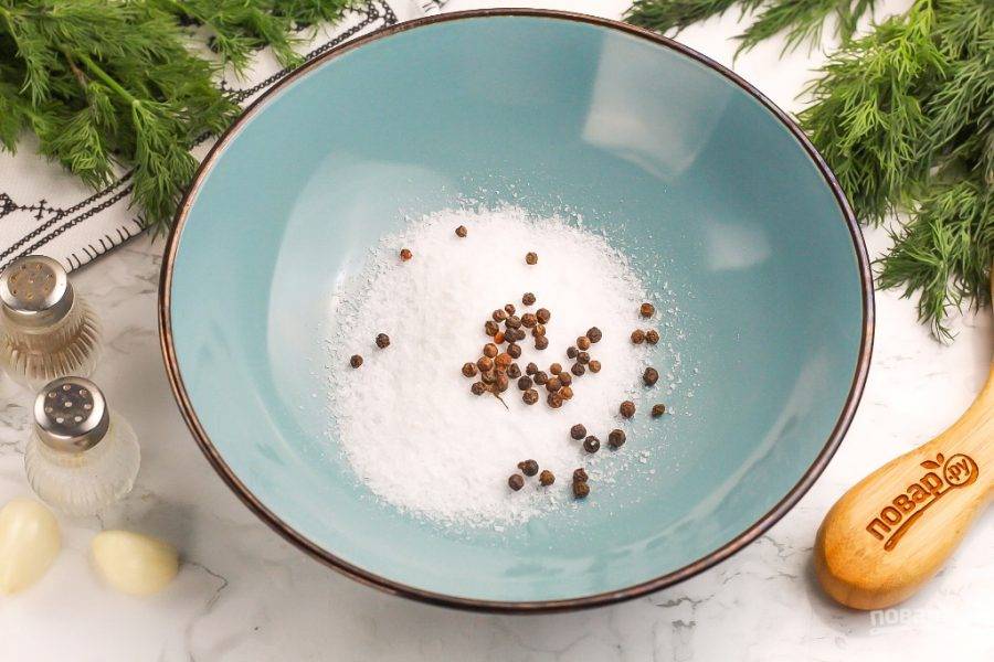 В миску или салатник всыпьте соль и сахарный песок, горошины черного перца. Можно добавить и другие пряности или специи, не перебивающие грибной вкус и аромат. Влейте холодную отфильтрованную воду и тщательно все перемешайте до растворения соли, сахара.