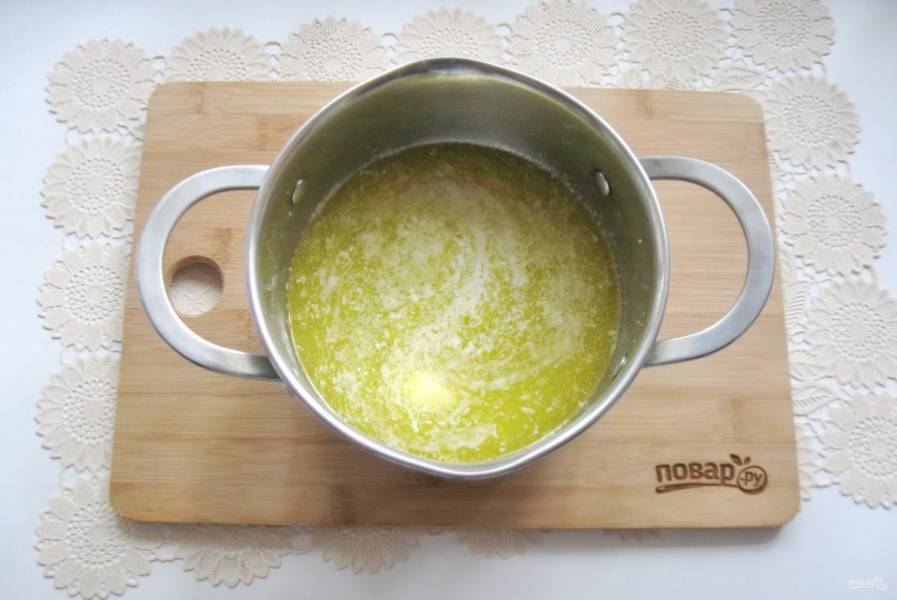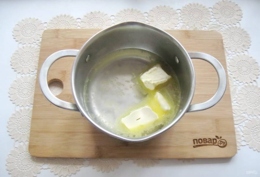 В кастрюлю налейте воду, выложите сливочное масло и поставьте на плиту.