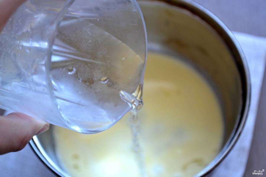 Не снимая с огня, добавьте муку небольшими порциями, активно помешивая. Тесто заварилось, но ему еще не хватает желтков.