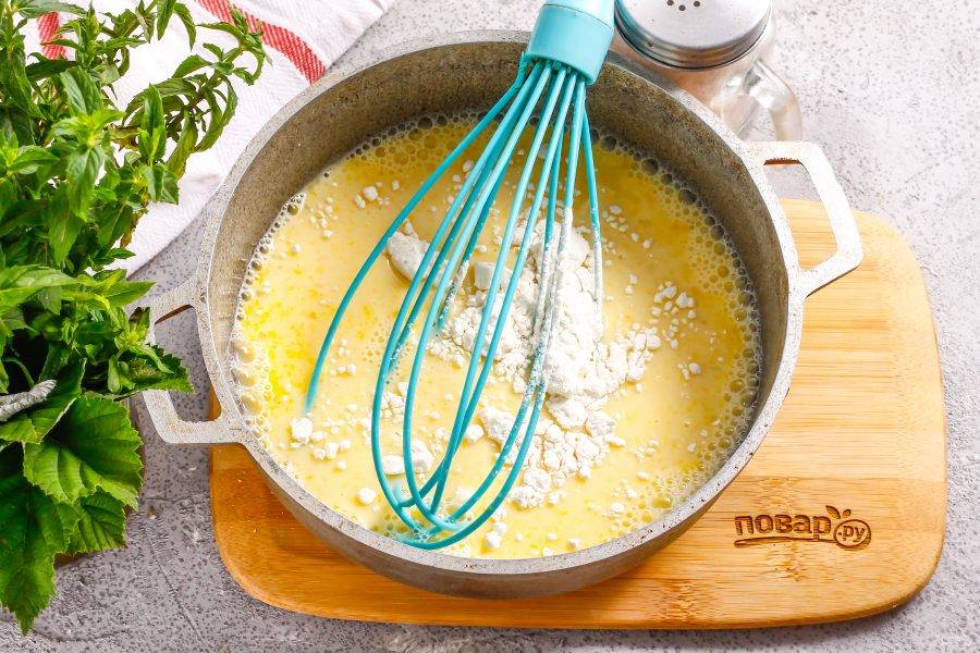 Всыпьте пшеничную муку и еще раз все взбейте. Лучше использовать венчик, чтобы мука не сбилась в комочки. Поместите емкость на плиту, включая минимальный нагрев.