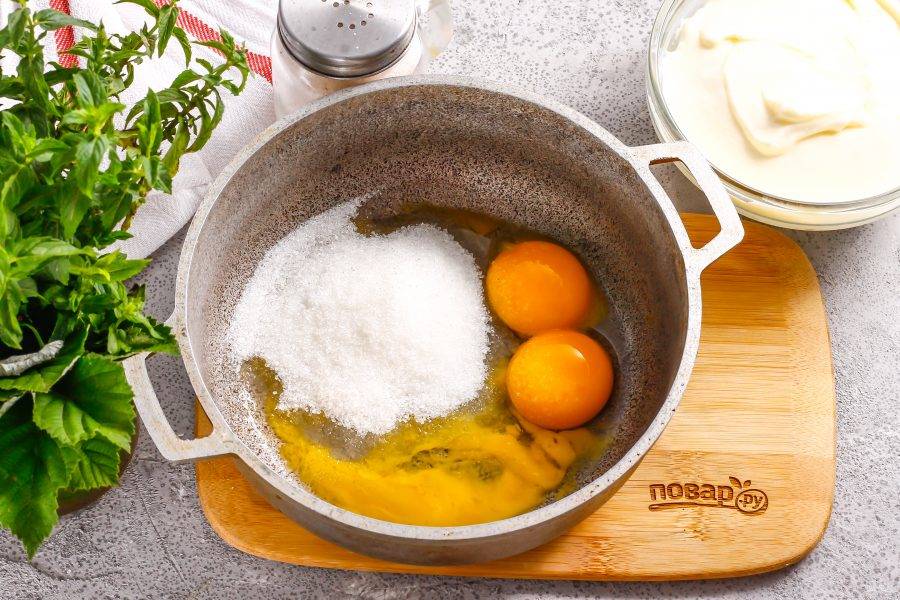 В казан или другую емкость с антипригарным дном высыпьте сахарный песок. Отделите желтки от белков, разбив куриные яйца. Белки используйте для другого рецепта, а желтки выложите в казан.