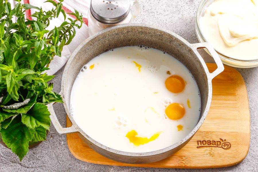 Влейте молоко любой жирности, всыпьте соль и взбейте все.