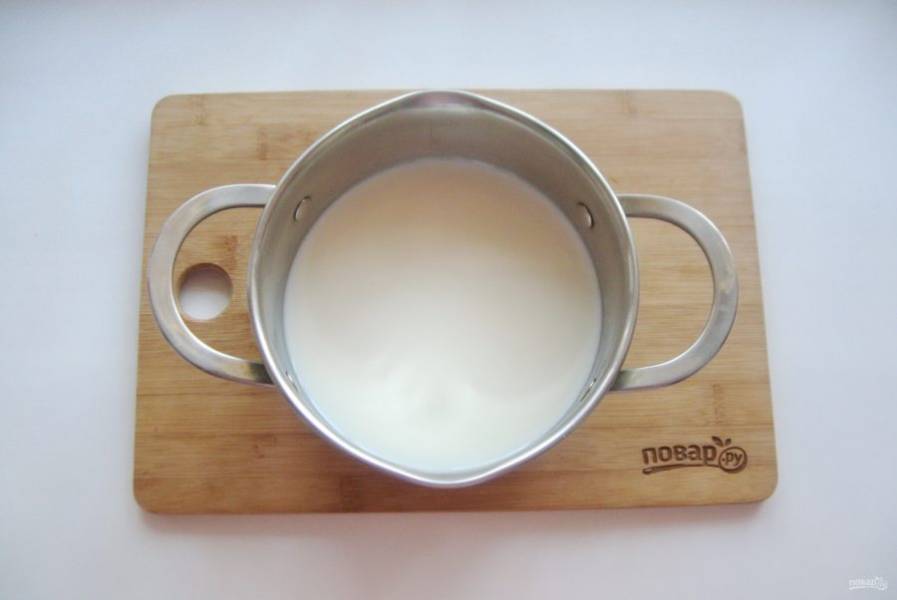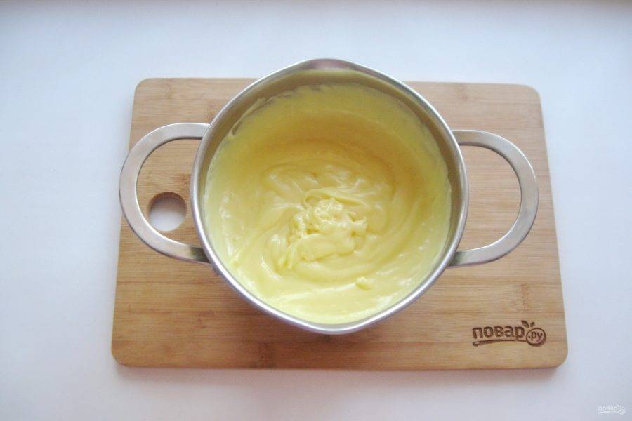 Когда молоко начнет закипать, влейте приготовленную смесь в кастрюлю и постоянно перемешивая венчиком, доведите крем до загустения. После крем охладите.