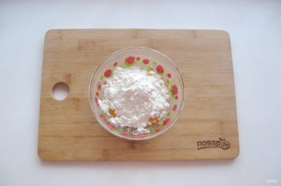 Налейте в мисочку 50 мл. холодного молока и тщательно перемешайте смесь желтков, сахара и крахмала. Комочков не должно быть.