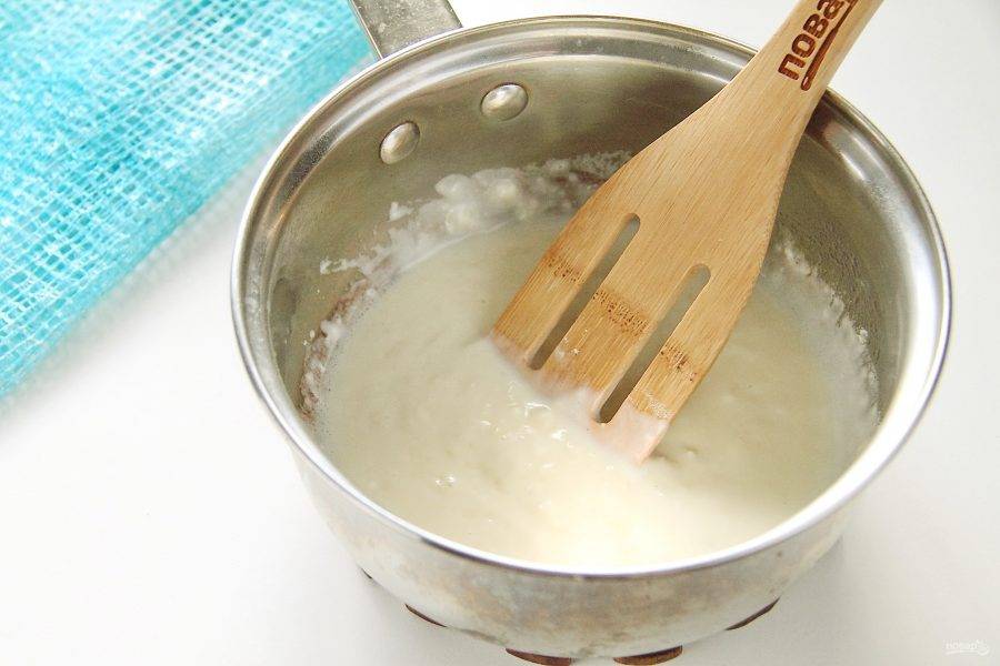 Оставшееся молоко доведите до кипения, добавьте к нему 25 грамм сливочного масла, перемешайте, снимите с огня и сразу же добавьте 25 грамм муки. Активно перемешайте комочки и дайте заварному тесту остыть.
