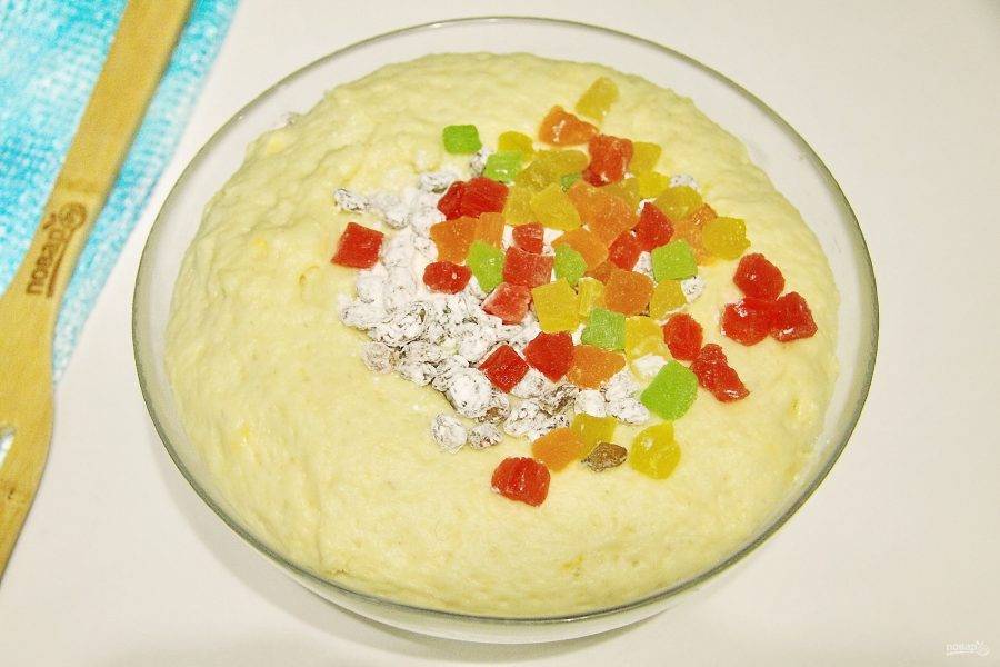 Тесто должно увеличиться примерно в два раза. Теперь можно добавить к нему обсушенный и обвалянный в муке изюм и цукаты.