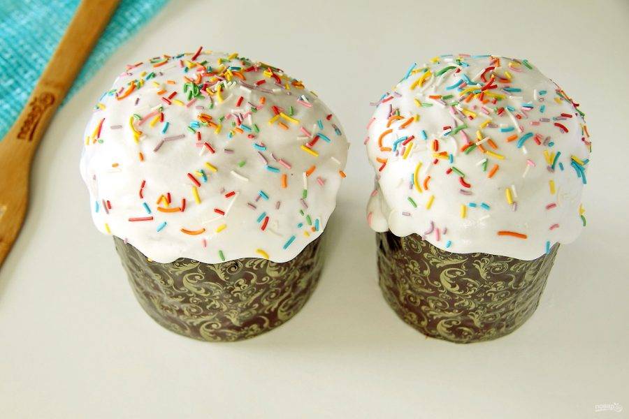 Готовые куличи смажьте глазурью и украсьте по вкусу.