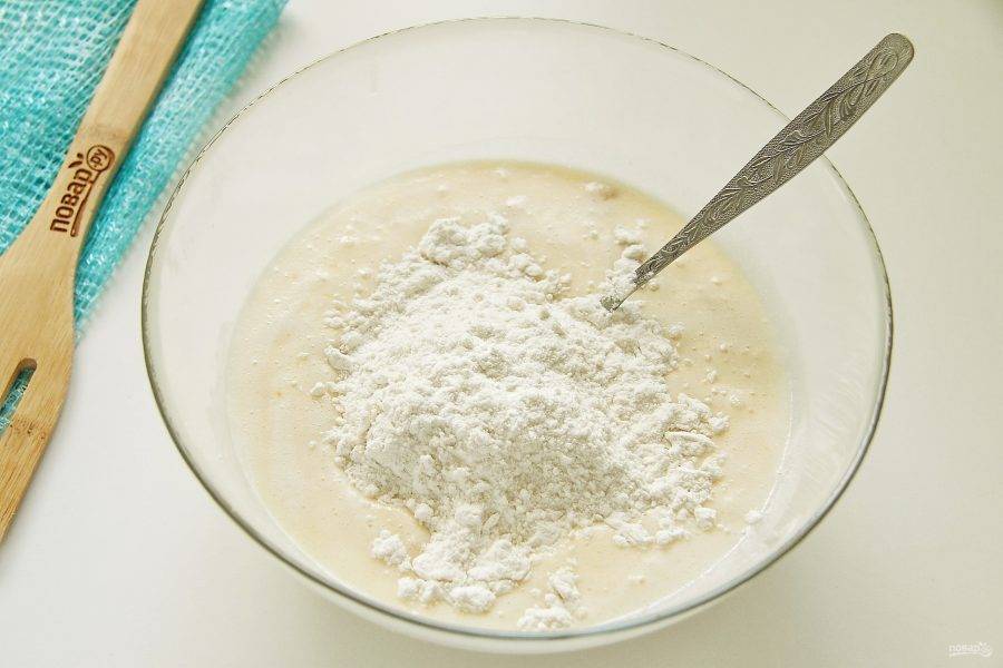 Добавьте желтковую массу, взбитые белки, остывшее заварное тесто и подошедшую опару. Перемешайте и добавьте просеянную муку.