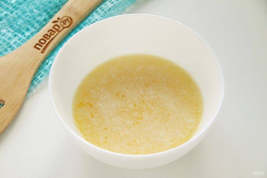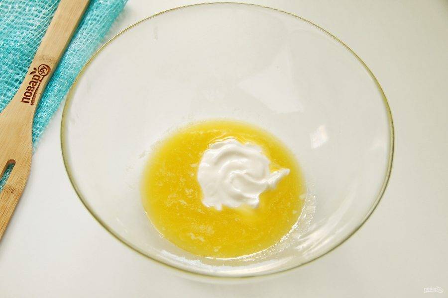 В глубокой миске соедините растопленное сливочное масло и сметану.