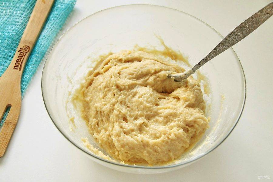 Должно получиться достаточно липкое, но густое тесто. Накройте его и дайте подойти в теплом месте 1-1,5 часа.