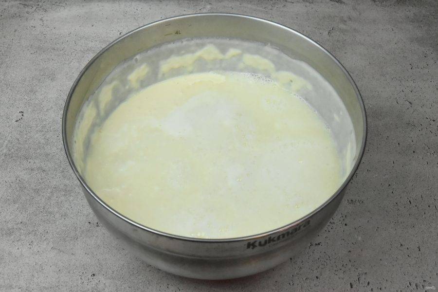 К взбитым яйцам добавьте йогурт и молоко. Молоко можно заранее подогреть в микроволновой печи в течение 1 минуты. Перемешайте массу.