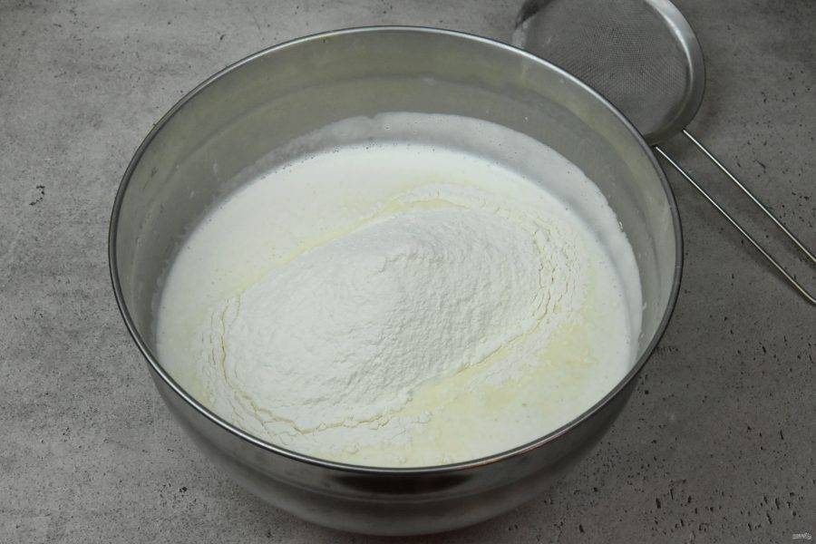 Муку просейте через мелкое сито и порциями введите в жидкую составляющую теста.