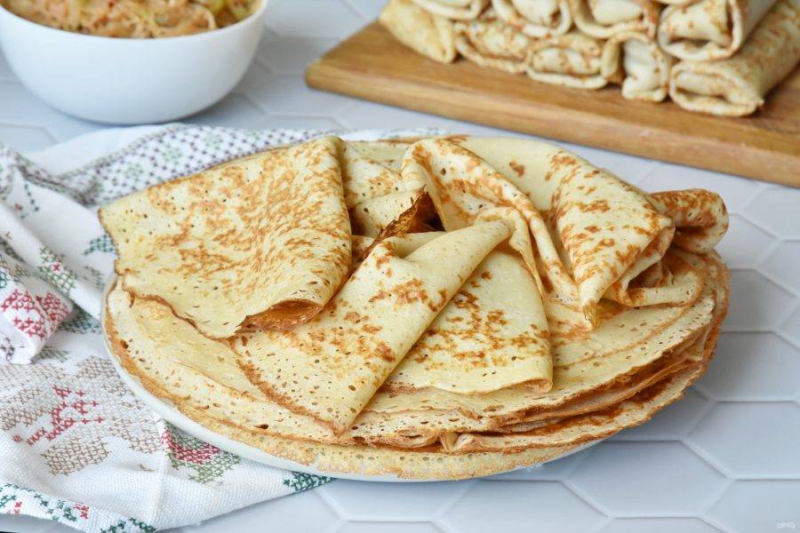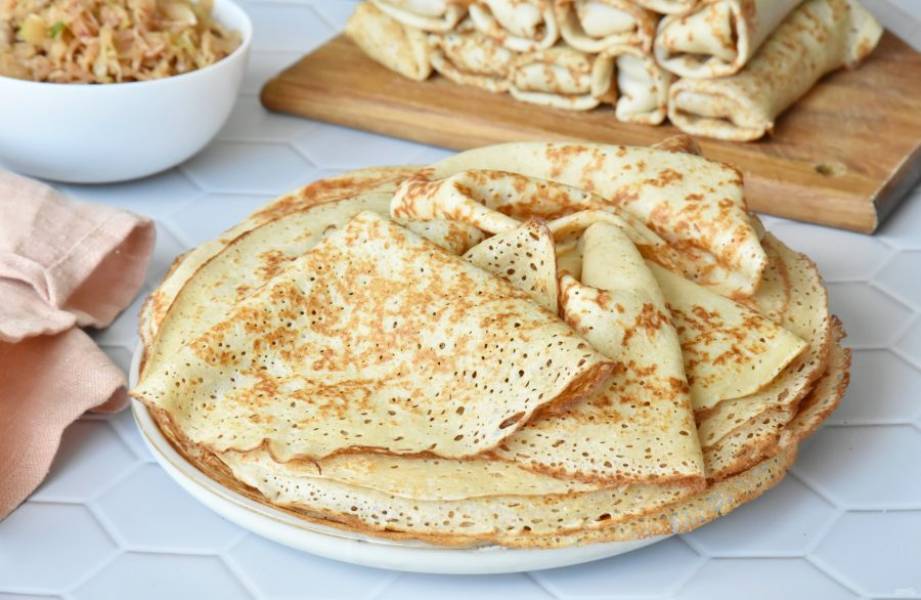 Готовим тоненькие, вкусные, кружевные блинчики. Они подойдут для фарширования или приготовления закусок. В зависимости от начинки, можно приготовить сладкий вариант, добавив в тесто больше сахара.