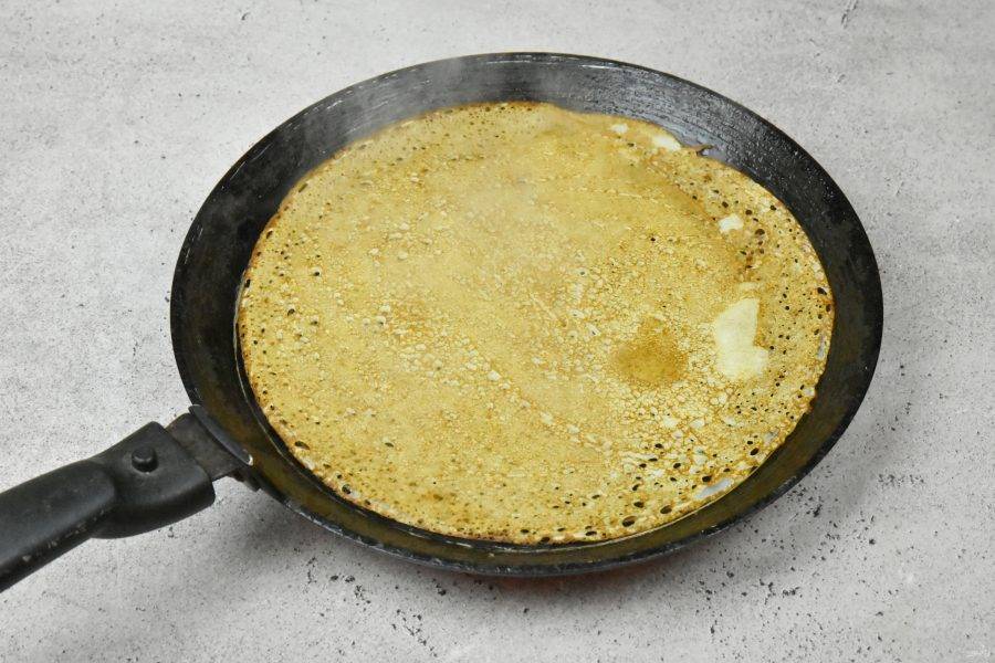 Когда края блина подрумянятся, поверхность станет матовой и покроется дырочками, переверните блин и обжарьте его с другой стороны.