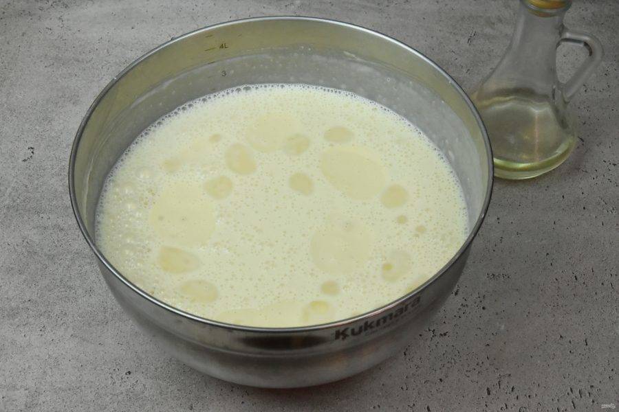В готовое тесто влейте растительное масло и еще раз перемешайте. Консистенция теста зависит от желаемой толщины готовых блинчиков.