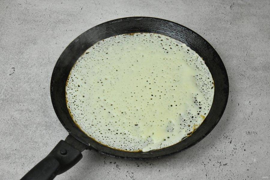 Для выпекания блинчиков воспользуйтесь хорошей сковородой (чугунной или с атипригарным покрытием). Хорошо разогрейте сковороду и нанесите небольшое количество масла. Влейте порцию блинного теста и распределите по всему периметру сковороды.