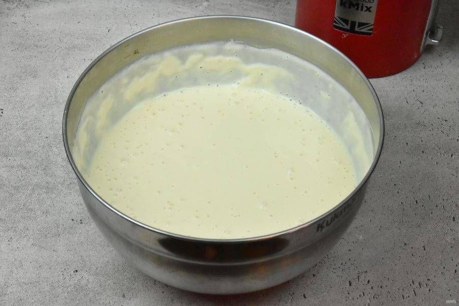 Замешайте густое блинное тесто. Для этой цели воспользуйтесь миксером или венчиком.