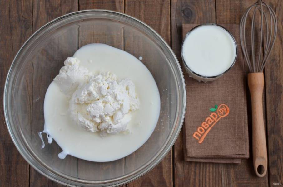 2. Венчиком разотрите кефир с творогом в однородную массу. Постарайтесь, чтобы не было комочков.