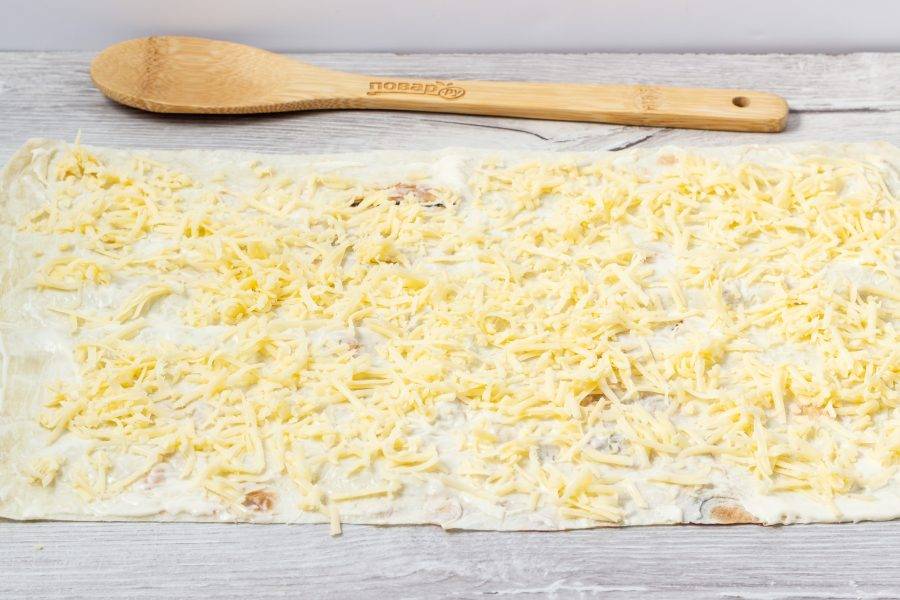 Первый слой лаваша смажьте с помощью силиконовой кисти майонезом, посыпьте сыром, натертым на мелкой терке.