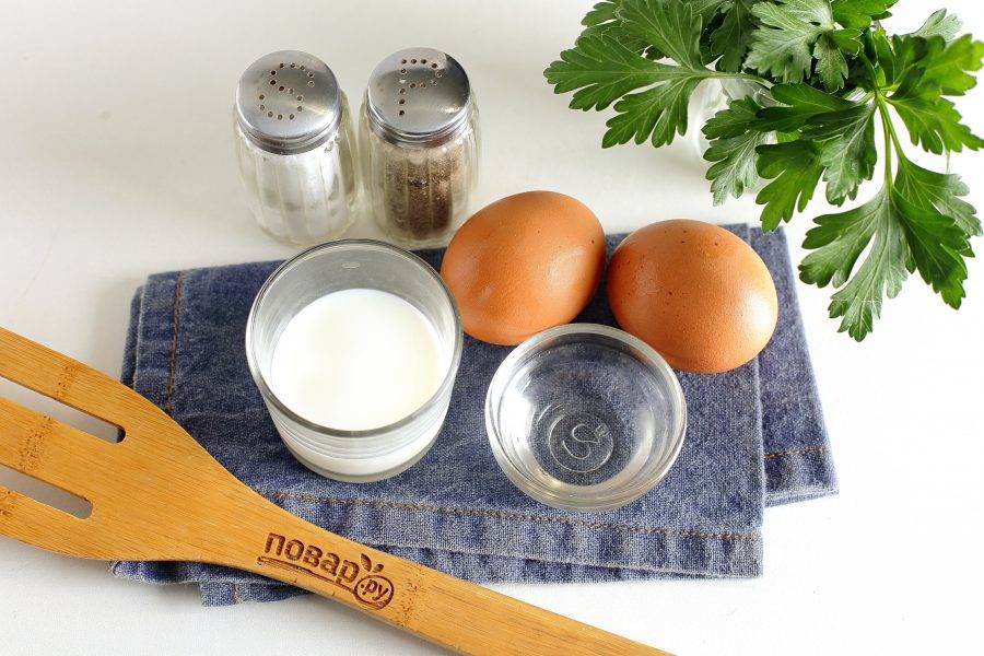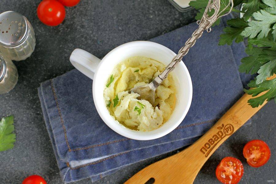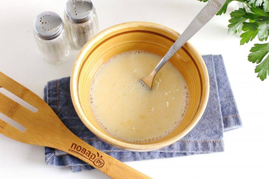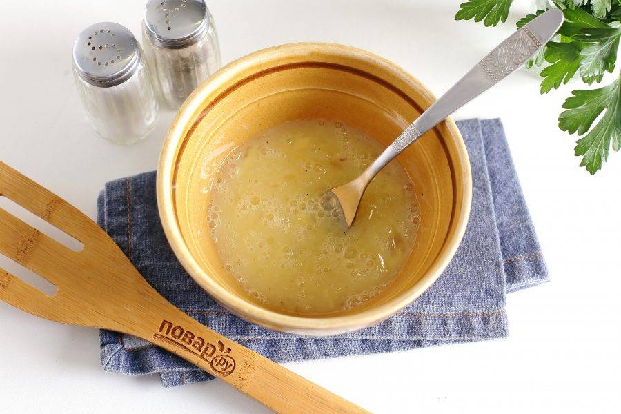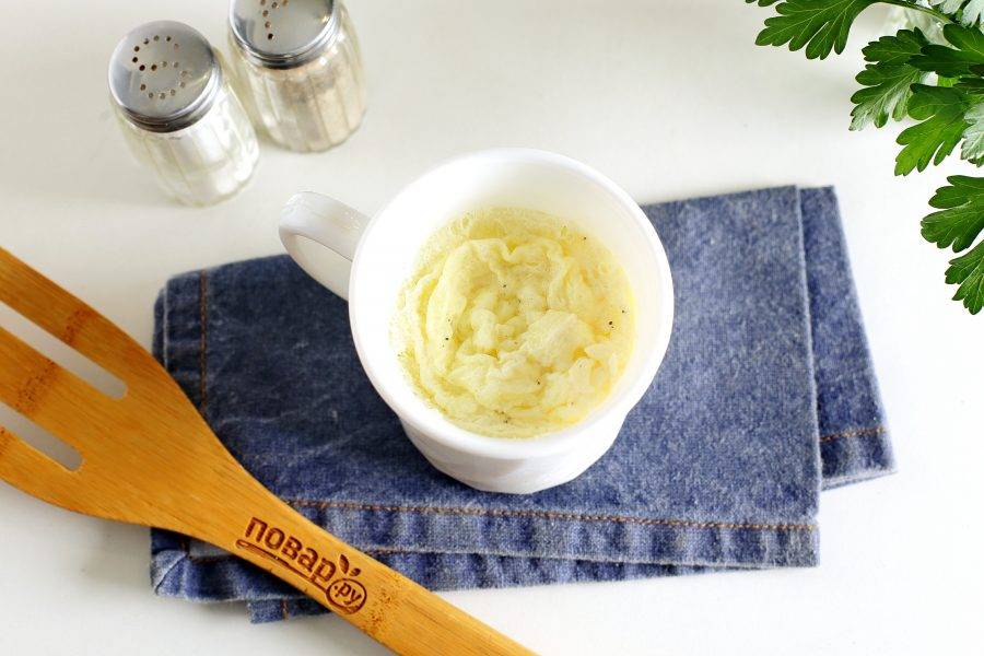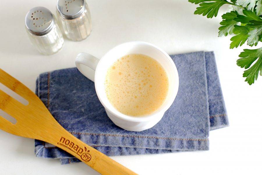 Стакан или любую подходящую по размеру емкость смажьте растительным маслом и вылейте яичную смесь.