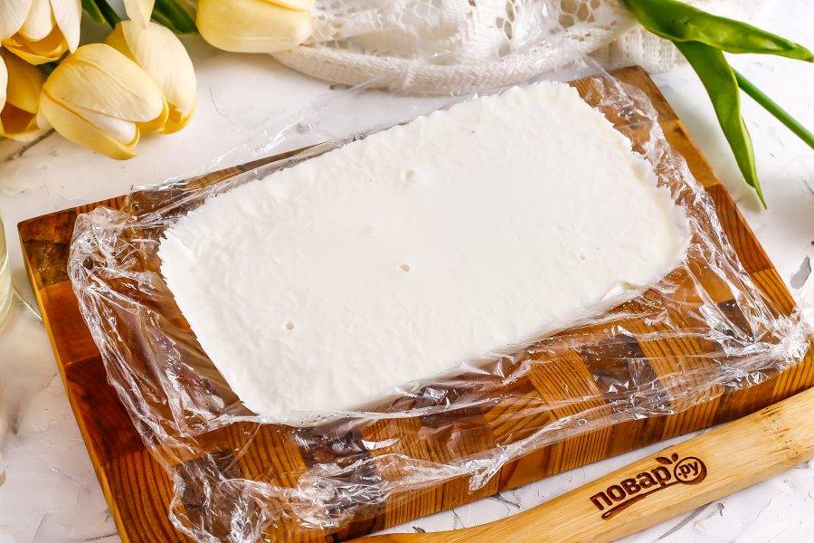Застелите плоскую квадратную емкость пищевой пленкой и перелейте в нее сметанную массу. Вынесите на холод либо поместите в холодильник на 1-2 часа для застывания. Желе должно очень прочно застыть!