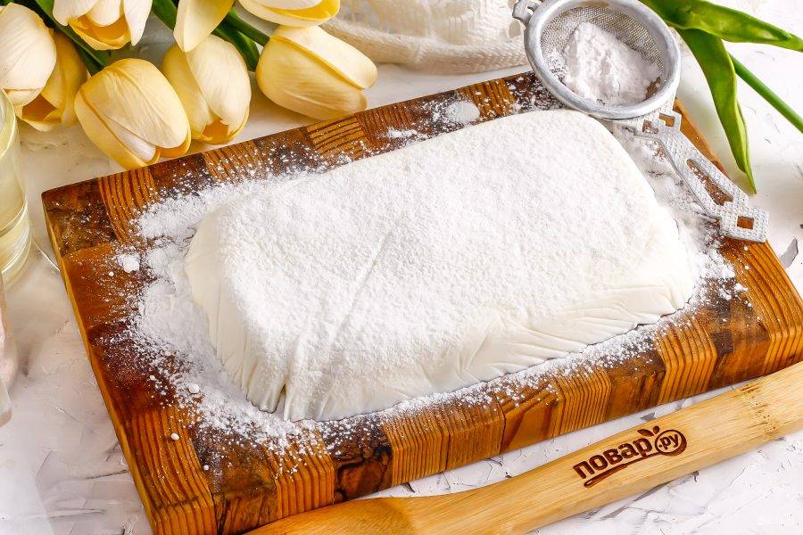 Присыпьте доску сахарной пудрой, переверните желе на пудру и снимите пленку. Затем и сверху присыпьте сахарной пудрой.