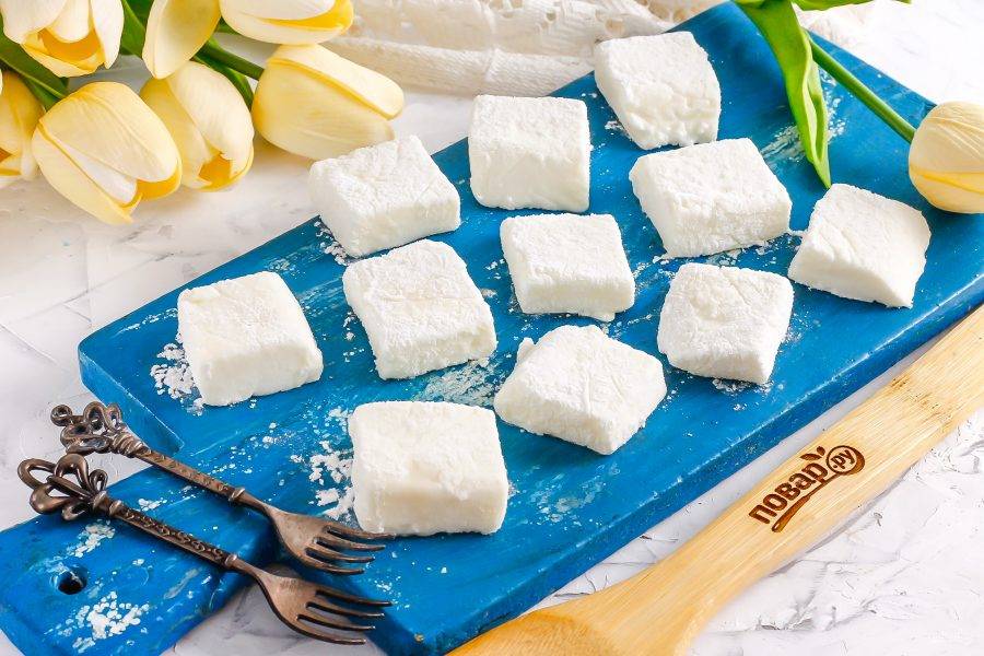 Присыпьте тарелку сахарной пудрой, нарежьте желе на квадраты и обпанируйте в пудре. Зефир готов!