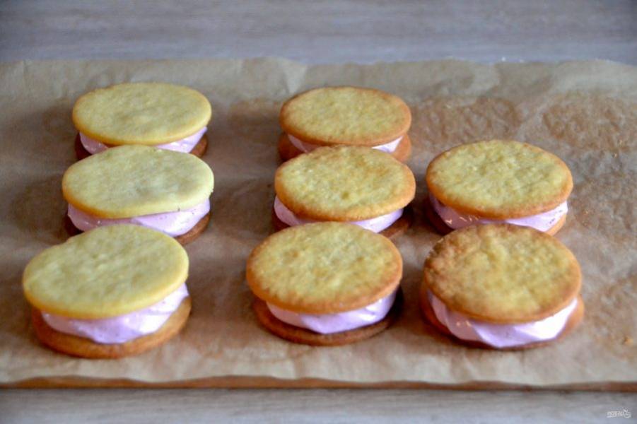 Переложите зефирную массу в кондитерский мешок с насадкой и отсадите прямо на печенье. Высоту зефирной прослойки регулируйте на свое усмотрение. Когда зефир слегка подстынет, выложите сверху еще одно печенье. Остатки зефирной массы отсадите на лист, как обычный зефир.