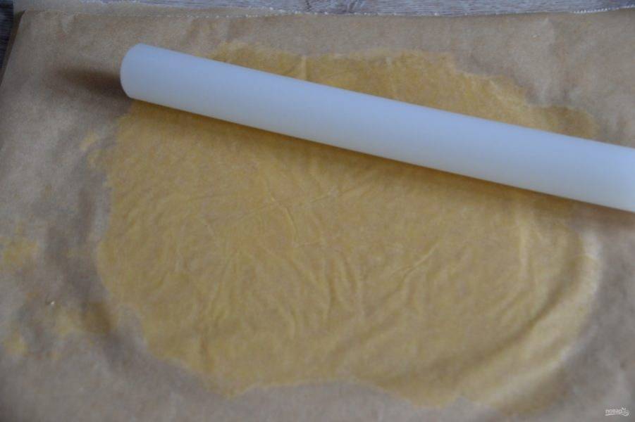 Раскатайте тесто в пласт толщиной примерно 4 мм. между двух листов пергамента, уберите на 30-40 минут для стабилизации.