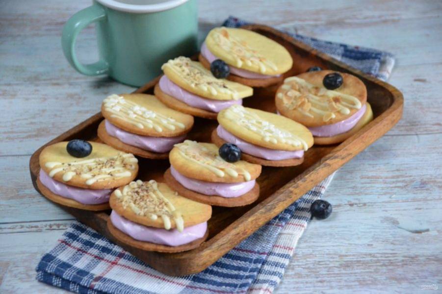 Дайте зефиру полностью стабилизироваться и подавайте вкусный и нежный десерт к столу. Получился невероятно вкусный "дуэт" из нежного песочного печенья и черничного зефира.