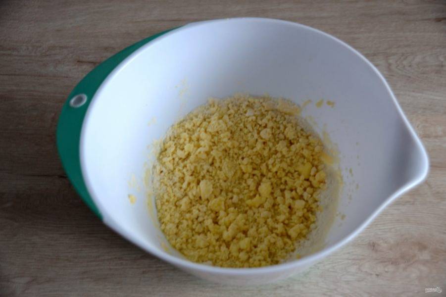 Измельчите тесто в крошку, соберите в шар, разделите на две части.