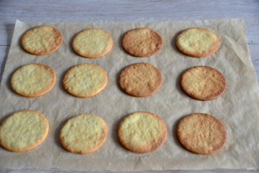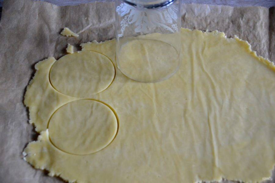 Вырежьте с помощью формы или тонкого стакана кружочки диаметром около 7 см. Выложите на лист для выпечки. Обрезки теста соберите и снова раскатайте в пласт.