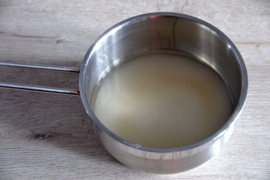 Выложите в ковш 250 грамм сахара, влейте 100 мл. воды, сварите сахарный сироп, доведите температуру сахарного сиропа до 105-108 градусов.
