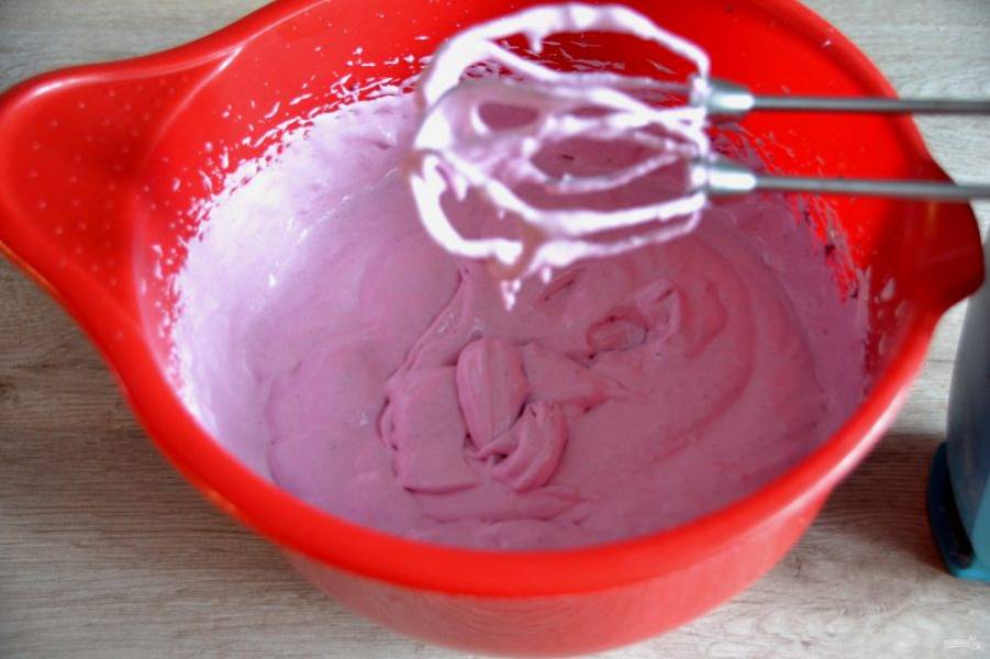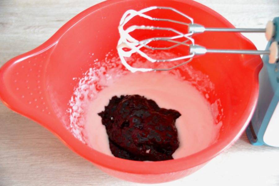 Взбейте яичный белок в пышную пену с 80 грамм сахара, добавьте остывшее ягодное пюре, взбейте вместе с пюре в пышную массу.