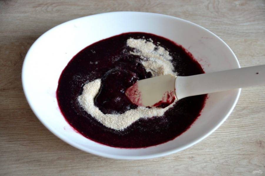Измельчите ягоды черники с помощью блендера в пюре, выложите в сотейник, уварите в течение 15-20 минут. Отмерьте 150 грамм ягодного пюре, добавьте смесь сахара с пектином, остудите в прохладном месте.