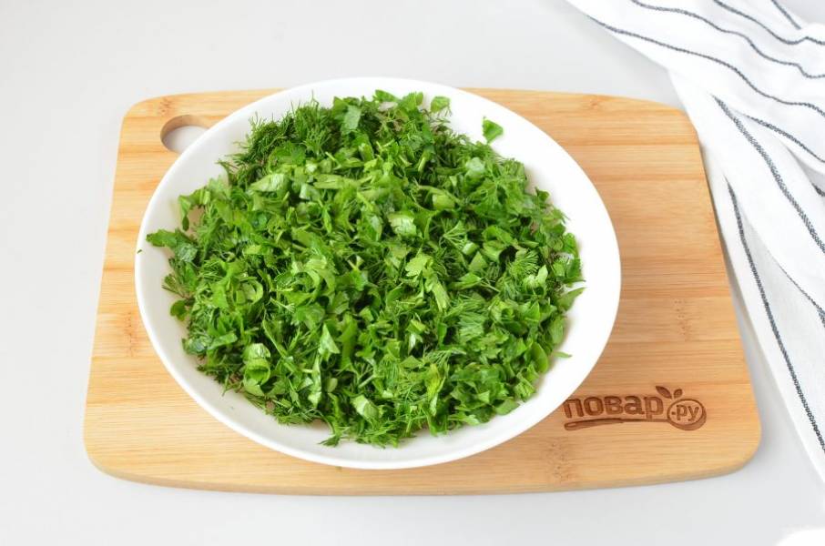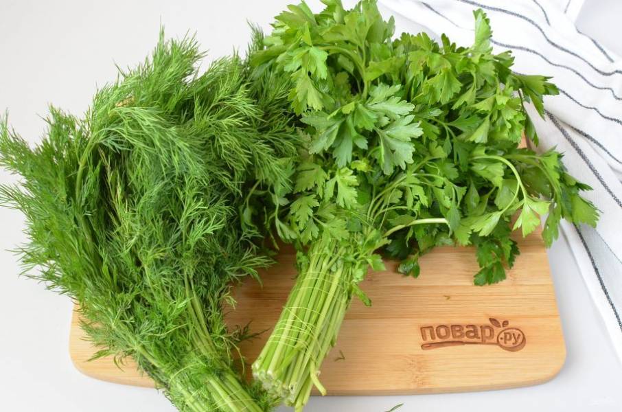 Пучки с зеленью замочите в холодной воде, затем хорошо промойте под проточной водой.