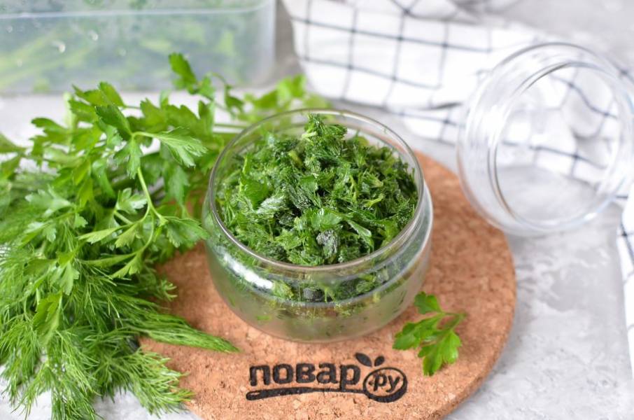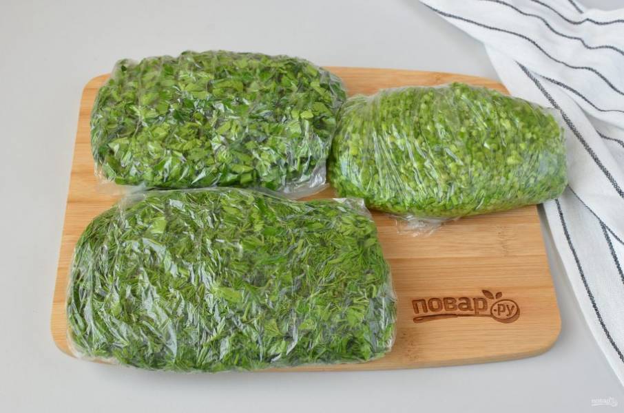 Разложите по пакетам, не наполняйте слишком пакеты, тонким слоем удобнее хранить зелень и потом легко отламывать нужный кусочек для супа или салата. Выдавите воздух из пакетов, завяжите. Уберите в морозилку и храните год.