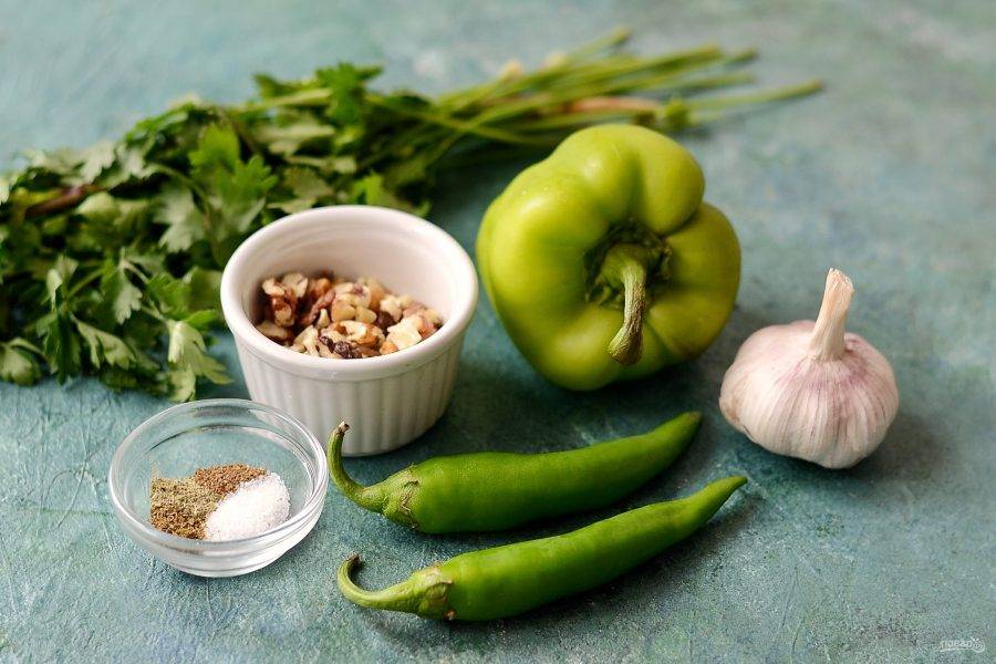 Измельчите перцы, орехи, зелень и чеснок в мясорубке.