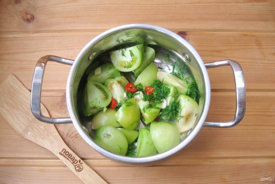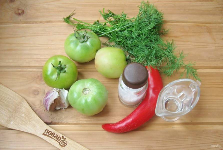 Подготовьте ингредиенты для приготовления зеленых помидоров на зиму.