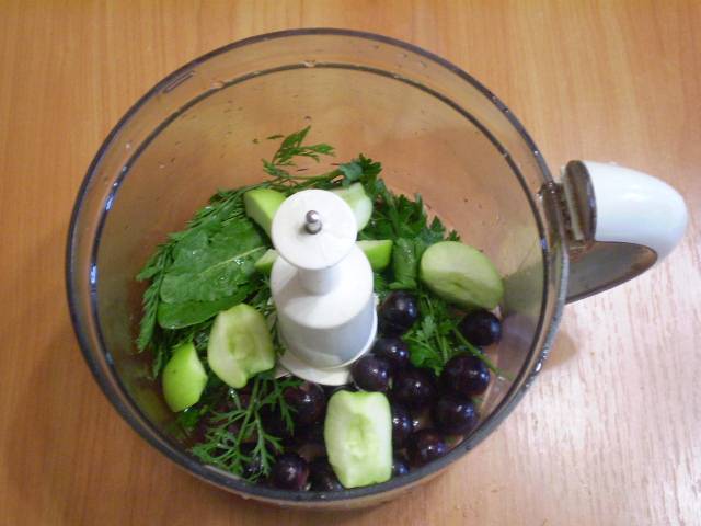 В чашу блендера складываем зелень, виноград, яблоки. Наливаем стакан воды.