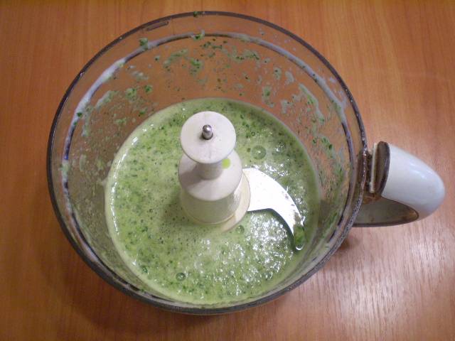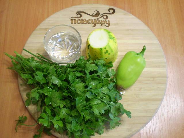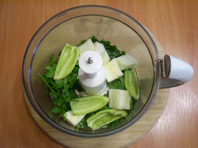 Складываем зелень, перец и кабачок в комбайн. Добавляем воду. Включаем прибор, и все тщательно измельчаем.
