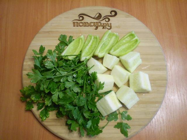 У зелени нужно обрезать толстые веточки, оставить только тонкие и листочки. У перца — удалить семена и хвостик. Кабачок очистить, если семена грубые, лучше вырежьте их.