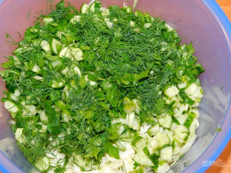 Капусту мелко нашинкуйте и немного помните руками, чтобы она стала мягче.