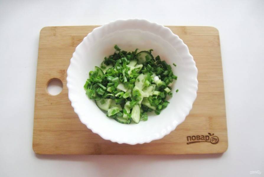 Зеленый лук помойте и мелко нарежьте. Добавьте в миску с огурцами.