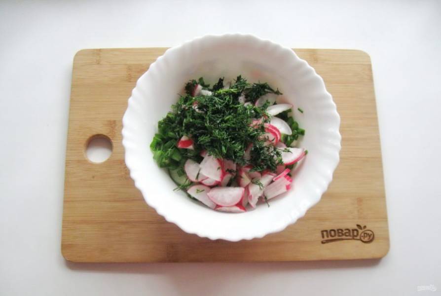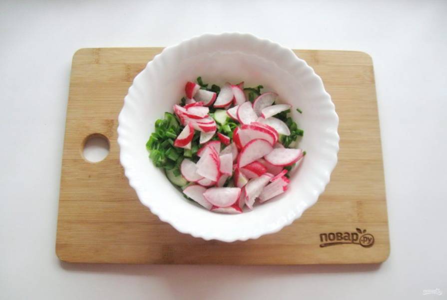 Редис помойте и нарежьте половинками кружков.