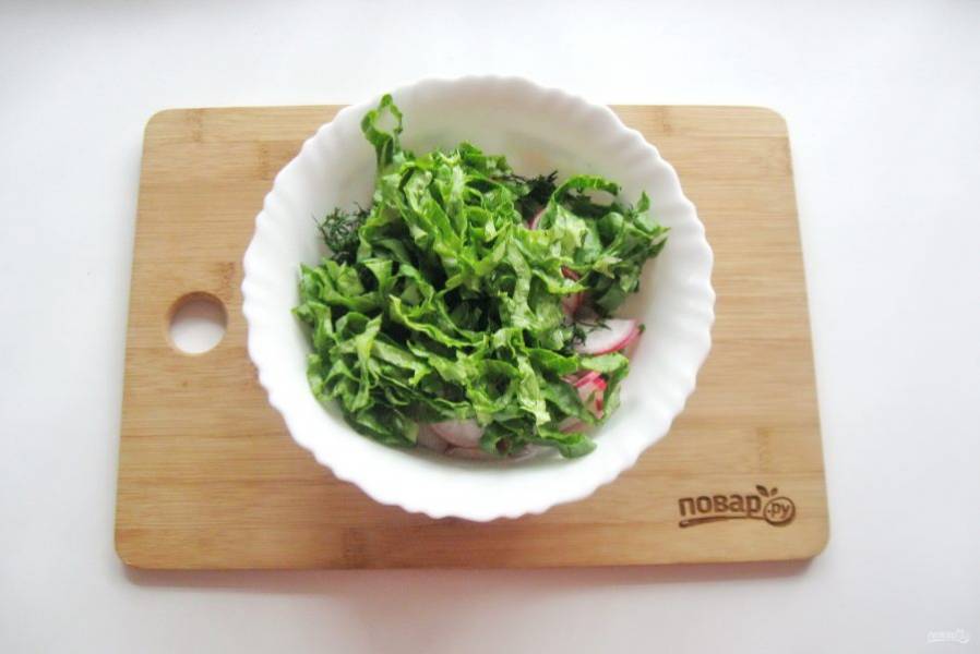 Укроп мелко нарежьте и добавьте в салат.